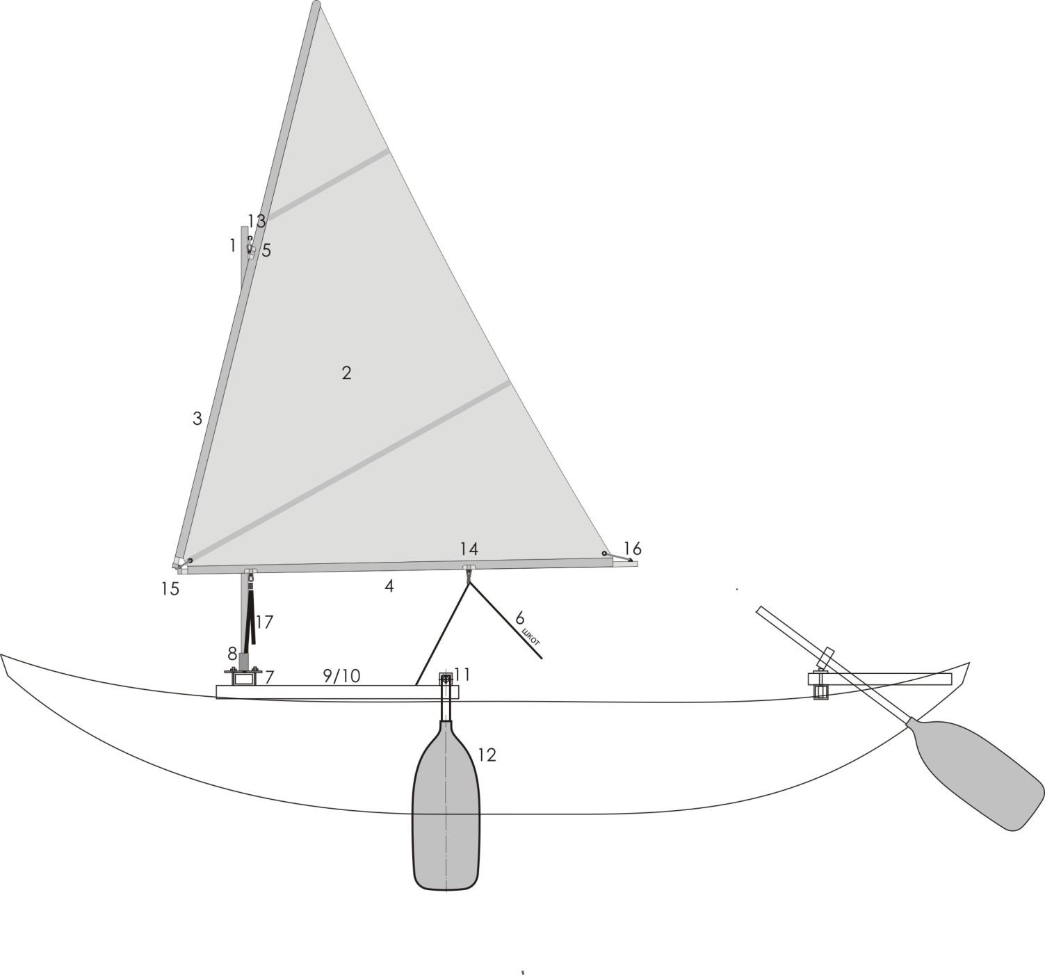 На мачту (1) поднимается грот (2), растянутый двумя рейками – верхним (3) и нижним (4). Рейки заправляются в карманы, пришитые к передней и нижней шкаторинам (кромкам) грота. На мачту грот поднимается фалом (5), переброшенным через кольцо в верхней части мачты. После подъема грота ходовой (свободный конец) фала крепиться к подмачтовой балке. На нижнем рейке, ближе к его ноку (заднему концу) закреплен шкот грота (6) – снасть для управления парусом.
